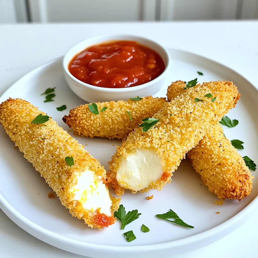 - Präsentationstipps: Serviere die Mozzarella-Sticks warm auf einem rustikalen Holzbrett, garniert mit frischer Petersilie, und füge eine kleine Schale Marinara-Sauce zum Dippen hinzu.