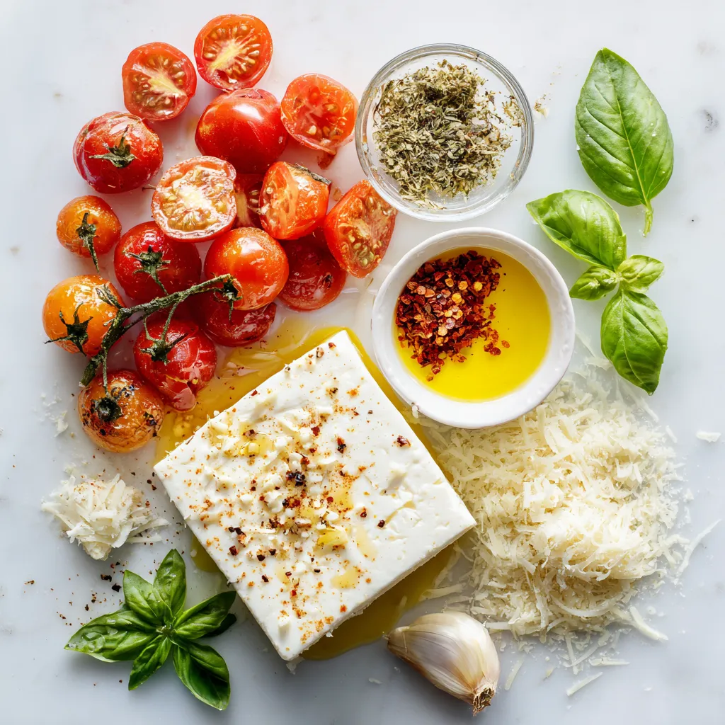 Die Hauptzutaten bilden die Basis dieses Gerichts. Ich empfehle, Penne oder Fusilli zu verwenden. Diese Pastaformen halten die Soße gut. Der Feta-Käse ist der Star des Rezepts. Er wird weich und cremig, wenn wir ihn backen. Kirschtomaten bringen Süße und Frische.