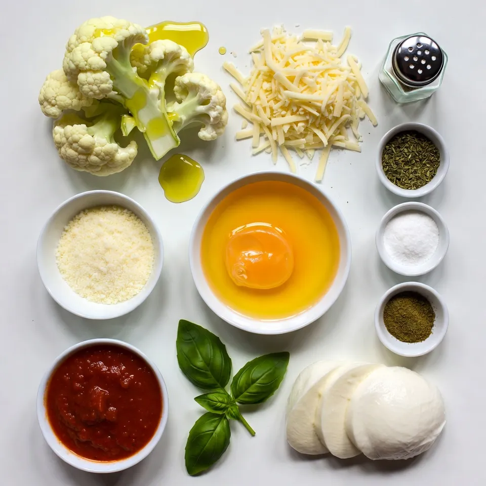Die Hauptzutaten sind der Schlüssel zu einer großartigen Blumenkohlkrusten-Margherita-Pizza. Blumenkohl macht die Kruste leicht und gesund. Mozzarella bringt die cremige Textur, während Parmesan einen tiefen Geschmack hinzufügt.