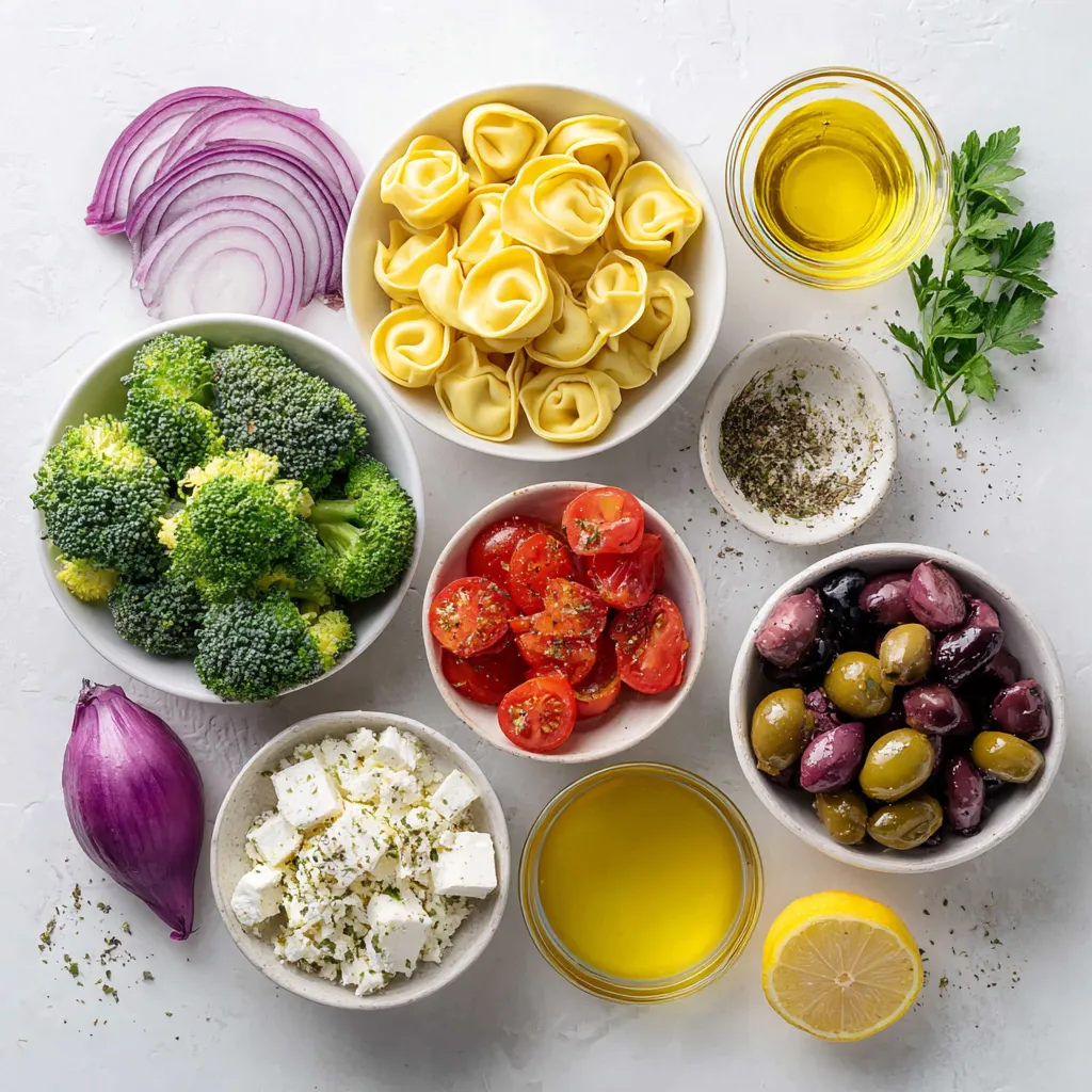 Die Hauptzutaten sind die Basis für diesen leckeren Salat. Die Käse-Tortellini sorgen für einen herzhaften Geschmack. Brokkoli bringt eine knackige Textur und viele Nährstoffe. Kirschtomaten fügen eine süße Note hinzu.