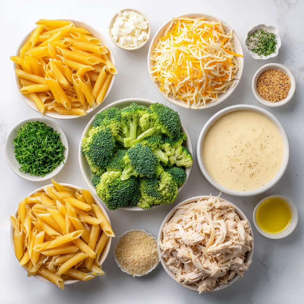 Diese Zutaten bilden die Basis für den Auflauf. Die Penne-Nudeln geben dem Gericht eine tolle Textur. Das zerkleinerte Hühnchen sorgt für einen herzhaften Geschmack. Die Brokkoli-Röschen fügen Farbe und wichtige Nährstoffe hinzu. Die Alfredo-Sauce macht das Ganze schön cremig.
