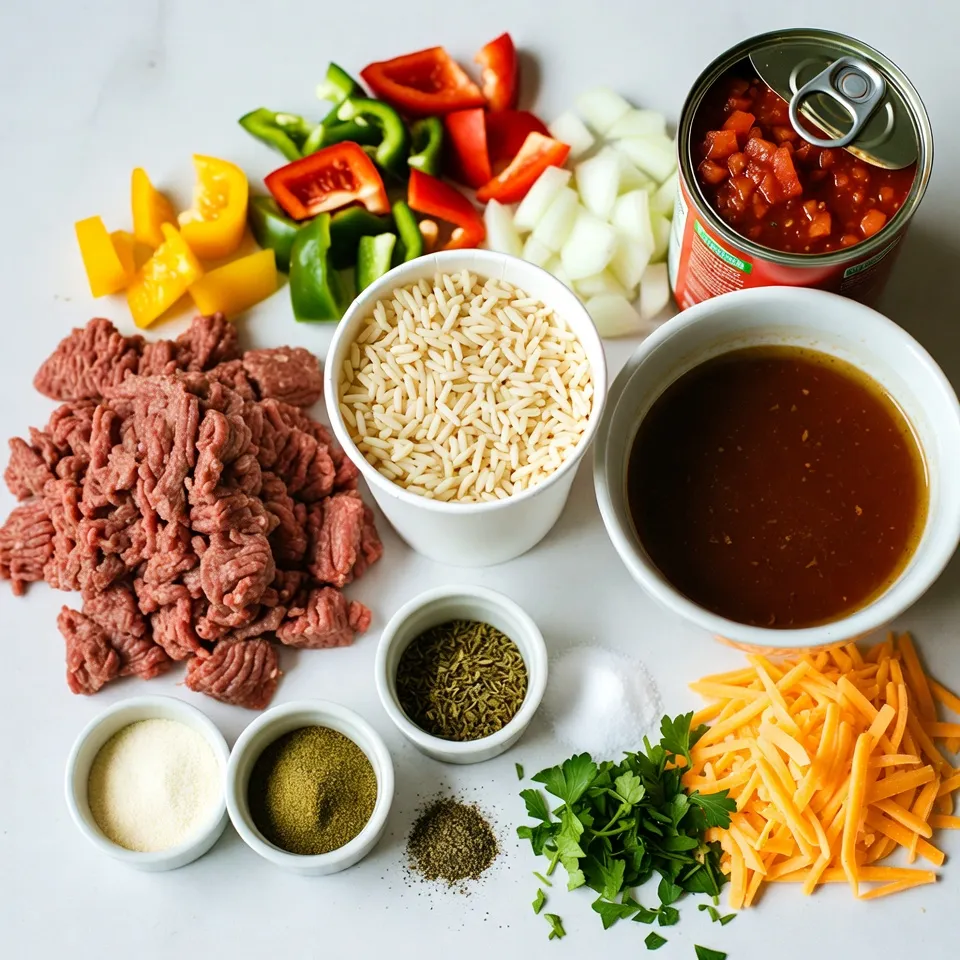 Die Hauptzutaten für diesen Auflauf sind einfach und schmackhaft. Rinderhackfleisch gibt dem Gericht seinen herzhaften Geschmack. Reis macht es sättigend und die Rinderbrühe bringt alles zusammen. Diese drei Zutaten bilden die Basis für ein tolles Essen.