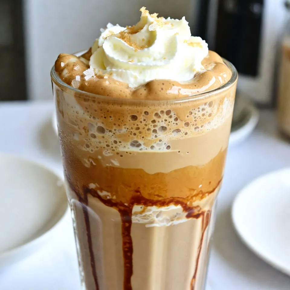 • Vollenden Sie das Getränk, indem Sie etwas Karamellsauce über die Schlagsahne träufeln und nach Belieben eine Prise Meersalz darüber streuen, um einen köstlichen Kontrast zu schaffen.
