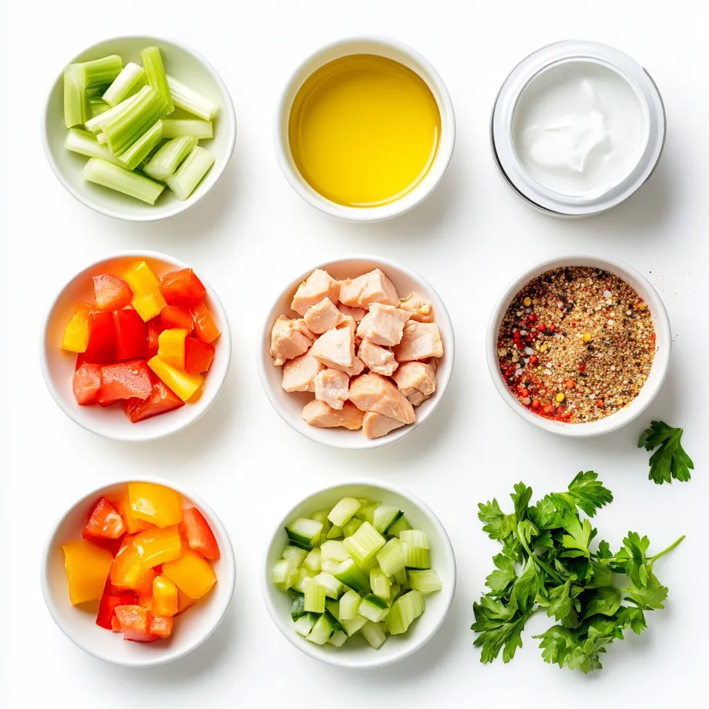 Zuerst würfle das Hähnchen. Nimm 450 g Hähnchenbrustfilet und schneide es in kleine Stücke. Dann bereite das Gemüse vor. Schneide eine Zwiebel, zwei Paprika (eine grüne und eine gelbe) und eine Tasse Sellerie. Diese Schritte machen das Kochen später einfacher und schneller.