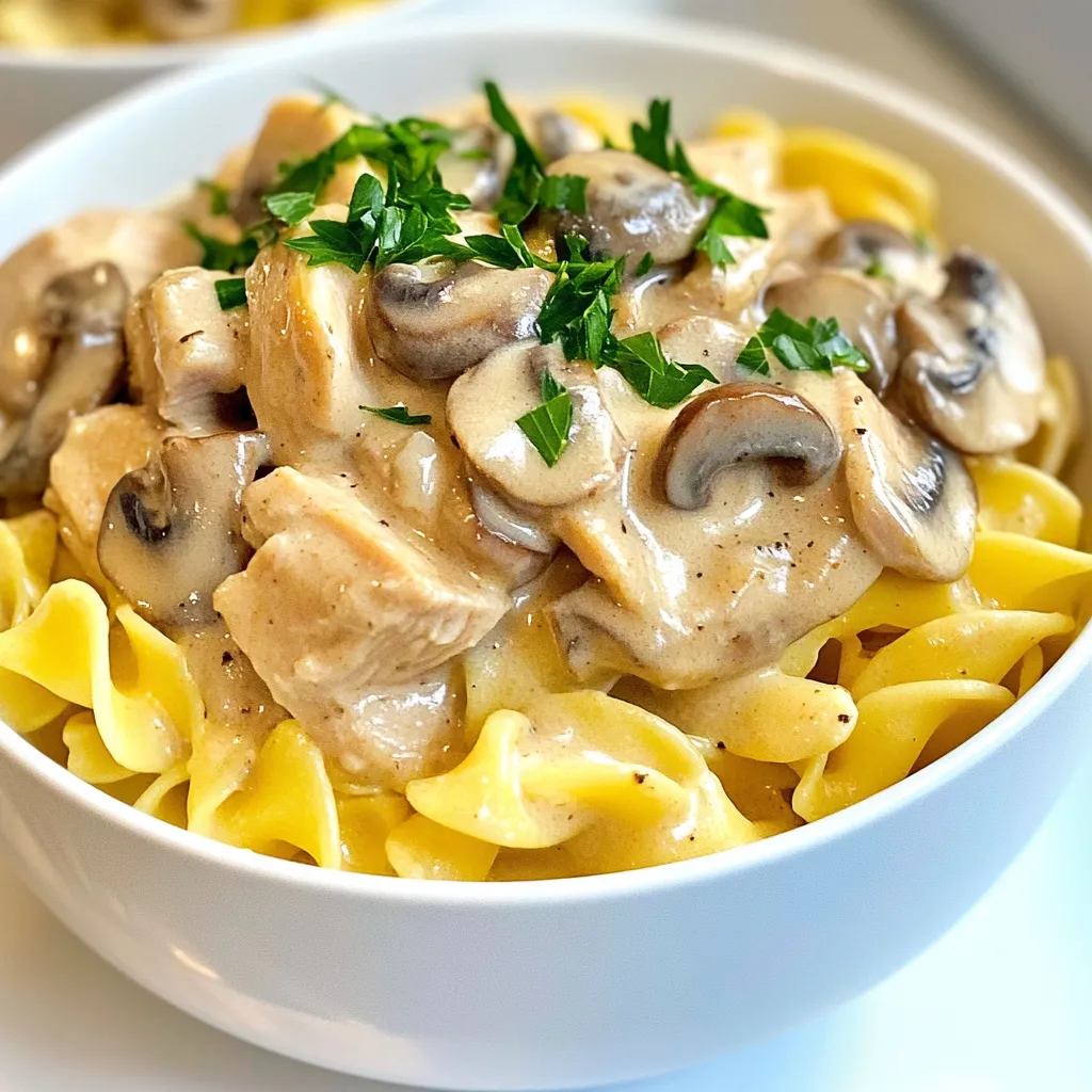 Servieren Sie den cremigen Truthahn Stroganoff in tiefen Schalen, garniert mit frischer Petersilie für einen Farbtupfer.