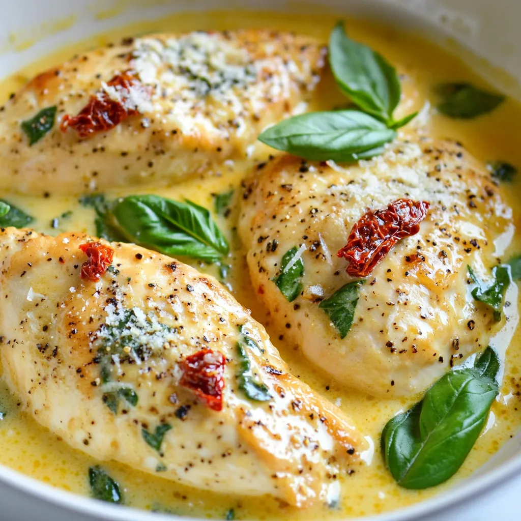 Sobald das Gericht fertig ist, serviere das Hähnchen mit der cremigen Soße darüber, garniert mit frischen Basilikumblättern.