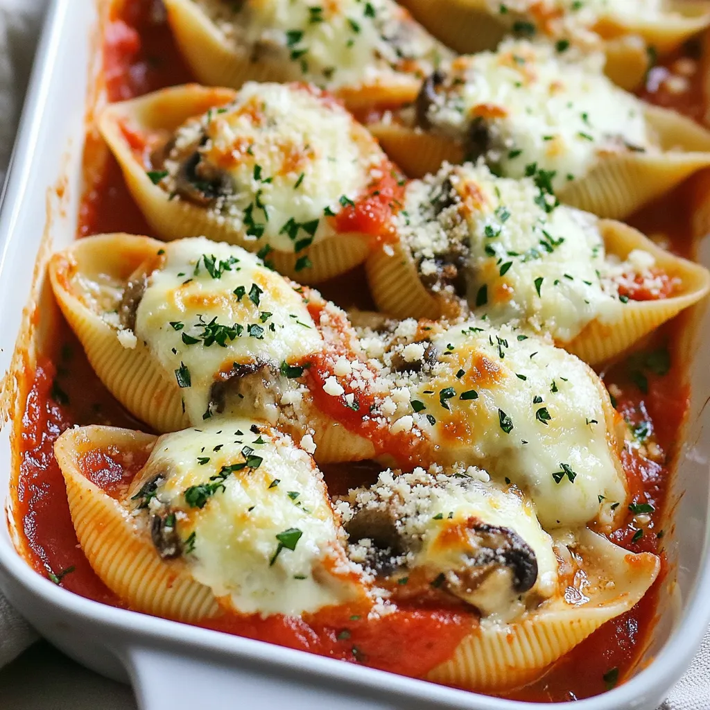 Eine köstliche Pasta mit einer Füllung aus Champignons, Knoblauch und Käse, überbacken mit Marinara-Soße.