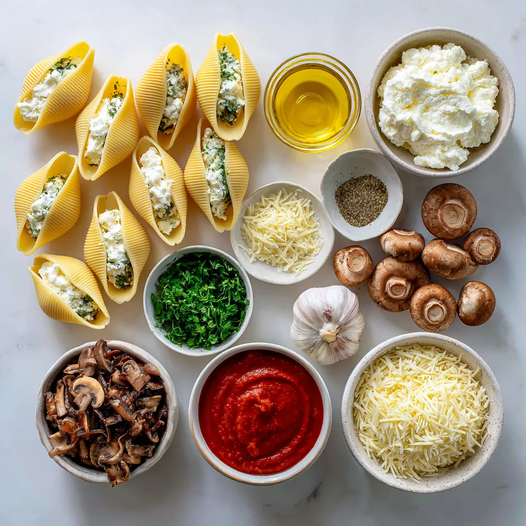 Um die perfekten Garlic Mushroom Stuffed Shells zu machen, brauchen Sie einige einfache Zutaten. Jumbo-Pasta-Muscheln sind die Basis. Diese großen Muscheln halten die Füllung gut. Dann kommen die Champignons. Ich empfehle, Cremini oder weiße Champignons zu nutzen. Sie geben viel Geschmack.