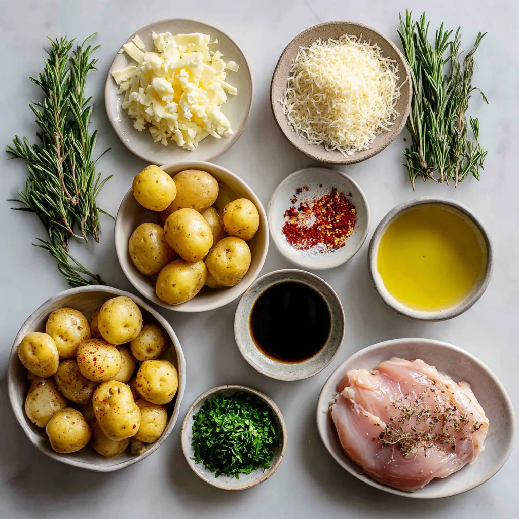 Ein köstliches Gericht mit zartem Hähnchen und würzigen Kartoffeln, überbacken mit Parmesan.