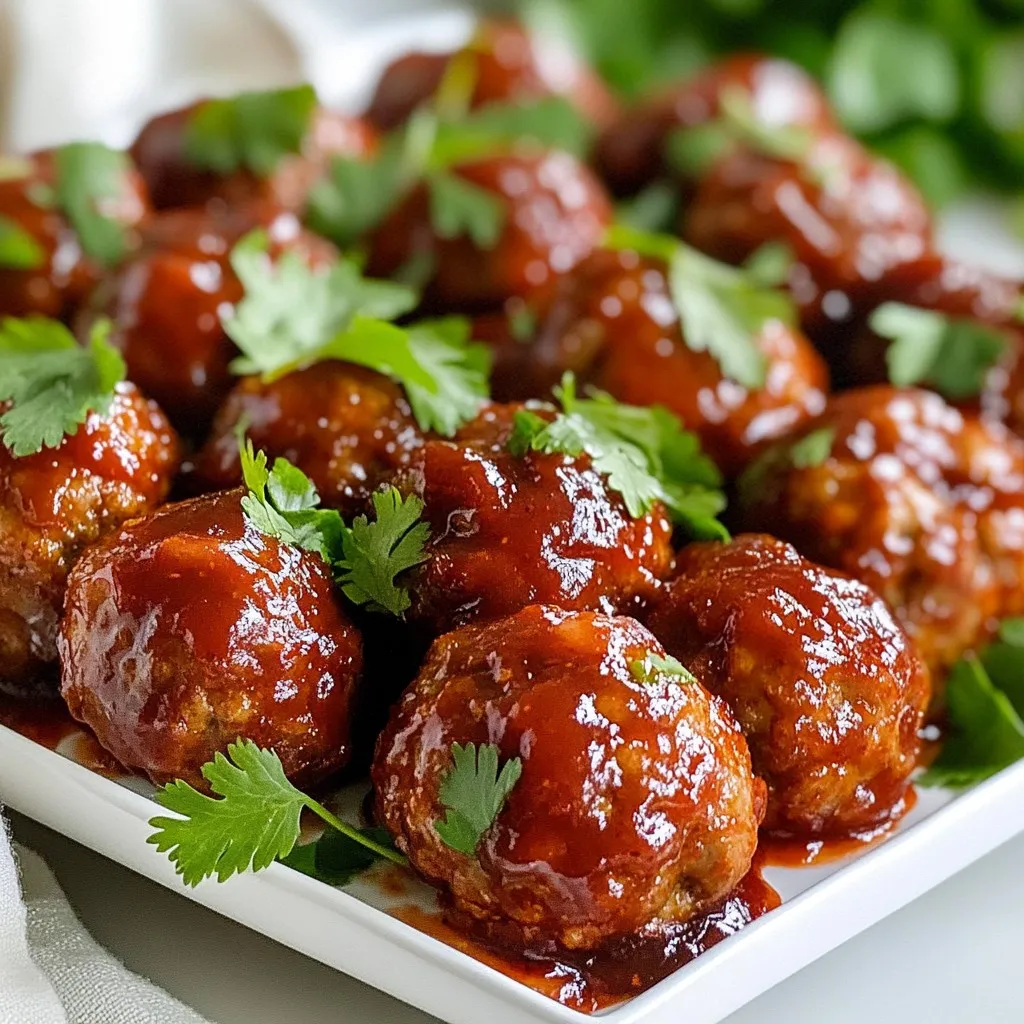 Serviere die Fleischbällchen auf einer Platte, garniert mit frischen Korianderblättern.