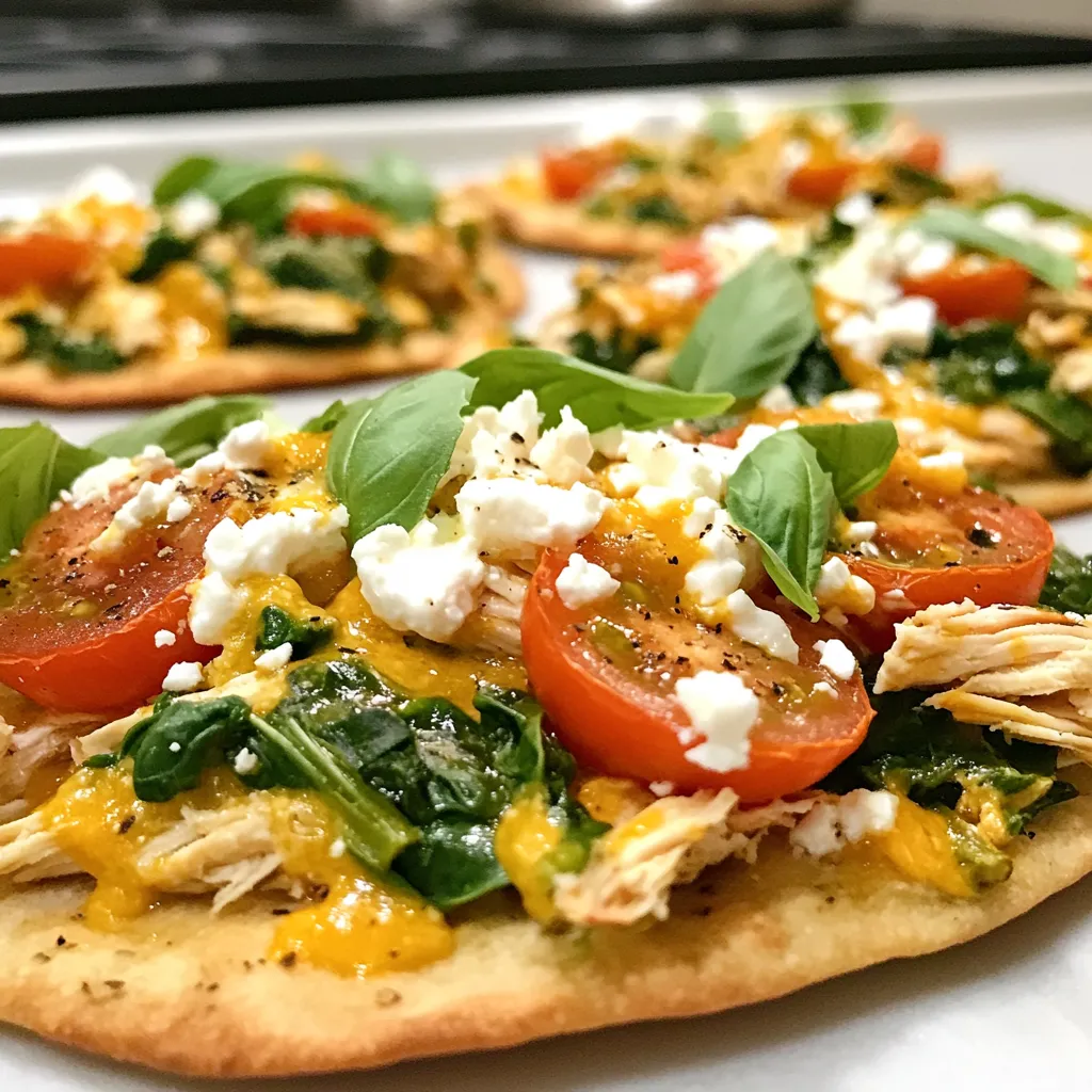 Ein köstliches Fladenbrot mit zerrupftem Hähnchen, frischem Spinat und Feta-Käse.