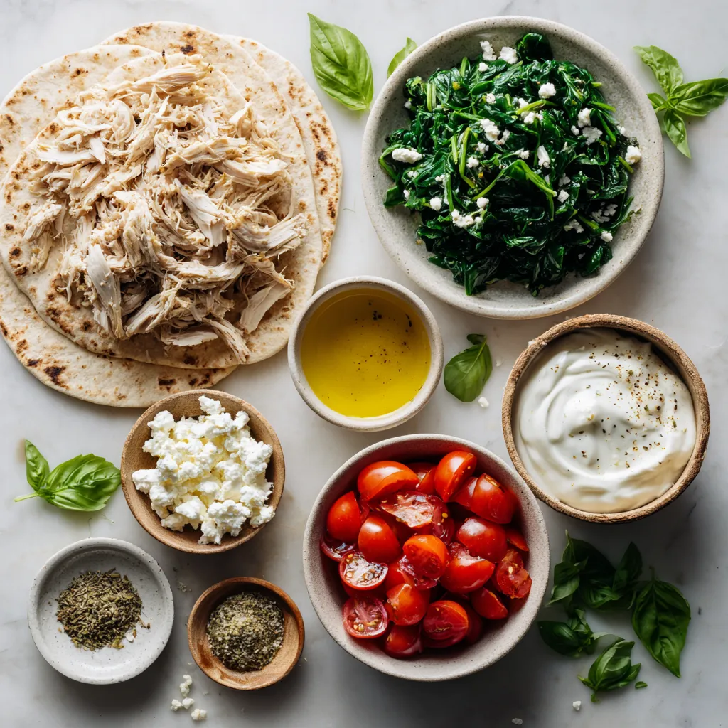Heize deinen Ofen auf 200°C vor. Das ist wichtig, um die Fladenbrote gleichmäßig zu backen. Nimm dir eine große Schüssel und lege alle Zutaten bereit. Du brauchst gekochte Hähnchenbrust, frischen Spinat, Kirschtomaten, Feta-Käse, griechischen Joghurt, Olivenöl, Knoblauch, Oregano, Salz und Pfeffer. Mit frischen Basilikumblättern garnierst du später.