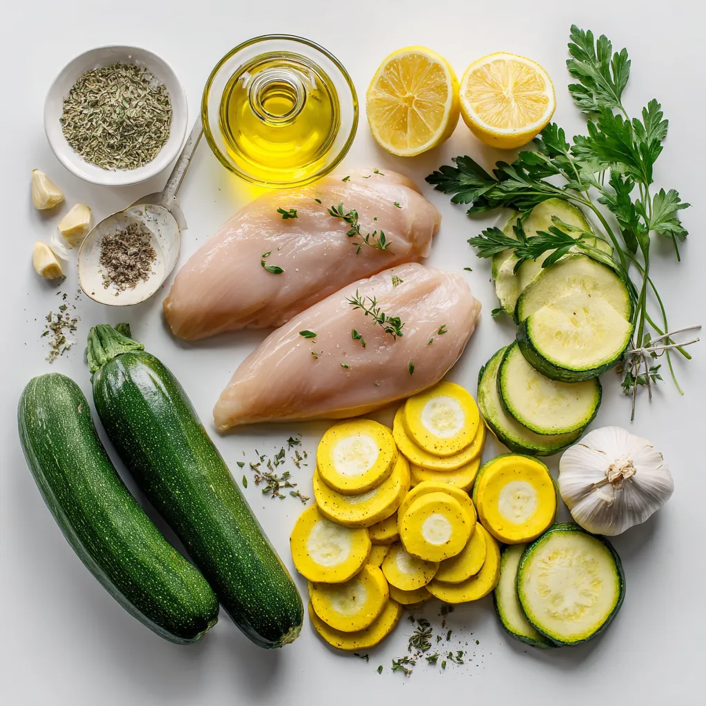 Ein köstliches und gesundes Gericht mit mariniertem Hühnchen, Zucchini und Kürbis, perfekt für ein Abendessen.