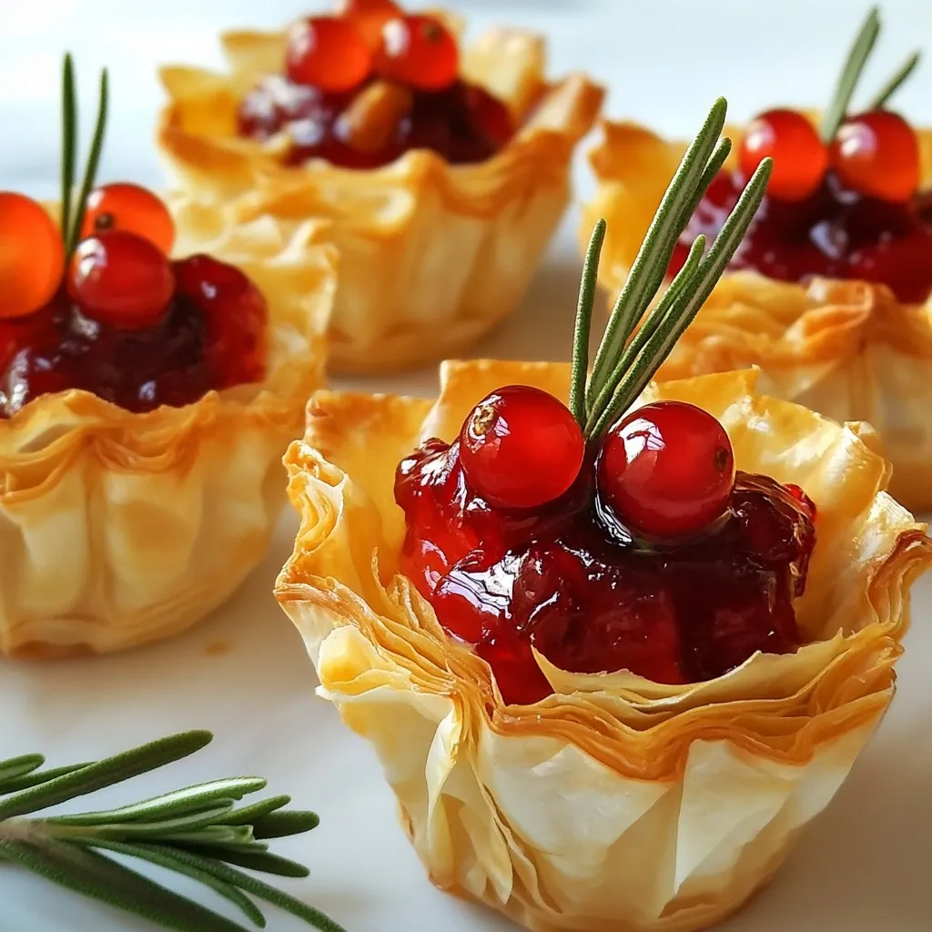 Servieren Sie die Phyllo Bites auf einem festlichen platter, garniert mit frischem Rosmarin für einen zusätzlichen Farbtupfer und Duft.