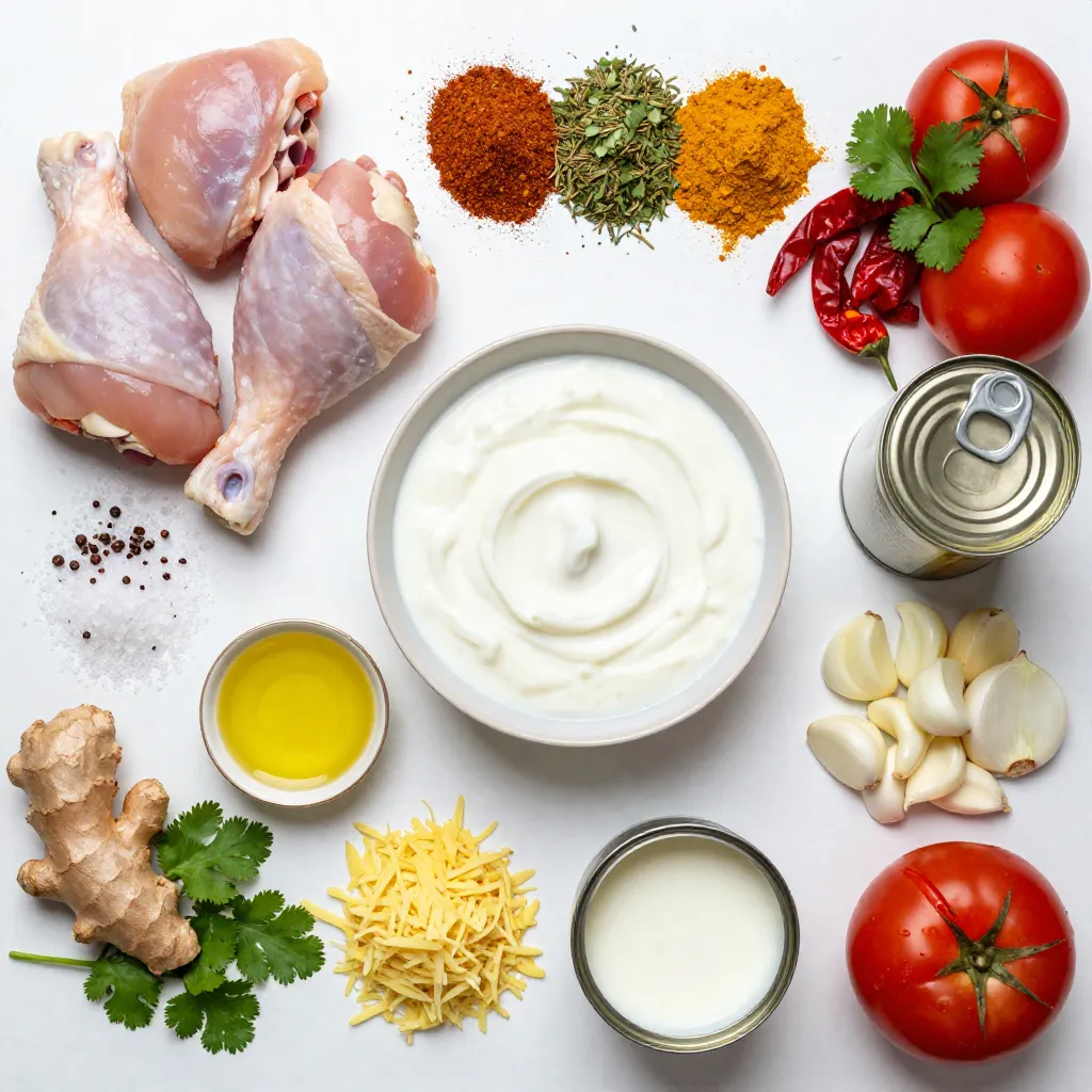 Diese Zutaten bilden die Basis für dein Gericht. Die Hähnchenschenkel sorgen für zarte Stücke, die im Instant Pot wunderbar garen. Joghurt bringt Cremigkeit und hilft, das Fleisch zart zu halten.
