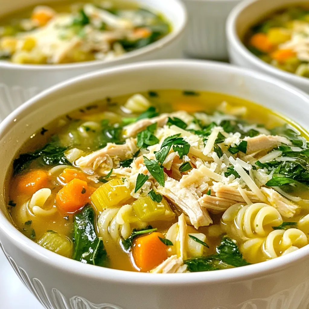 Eine köstliche und herzhafte Suppe mit Pasta, Gemüse und Hähnchen.