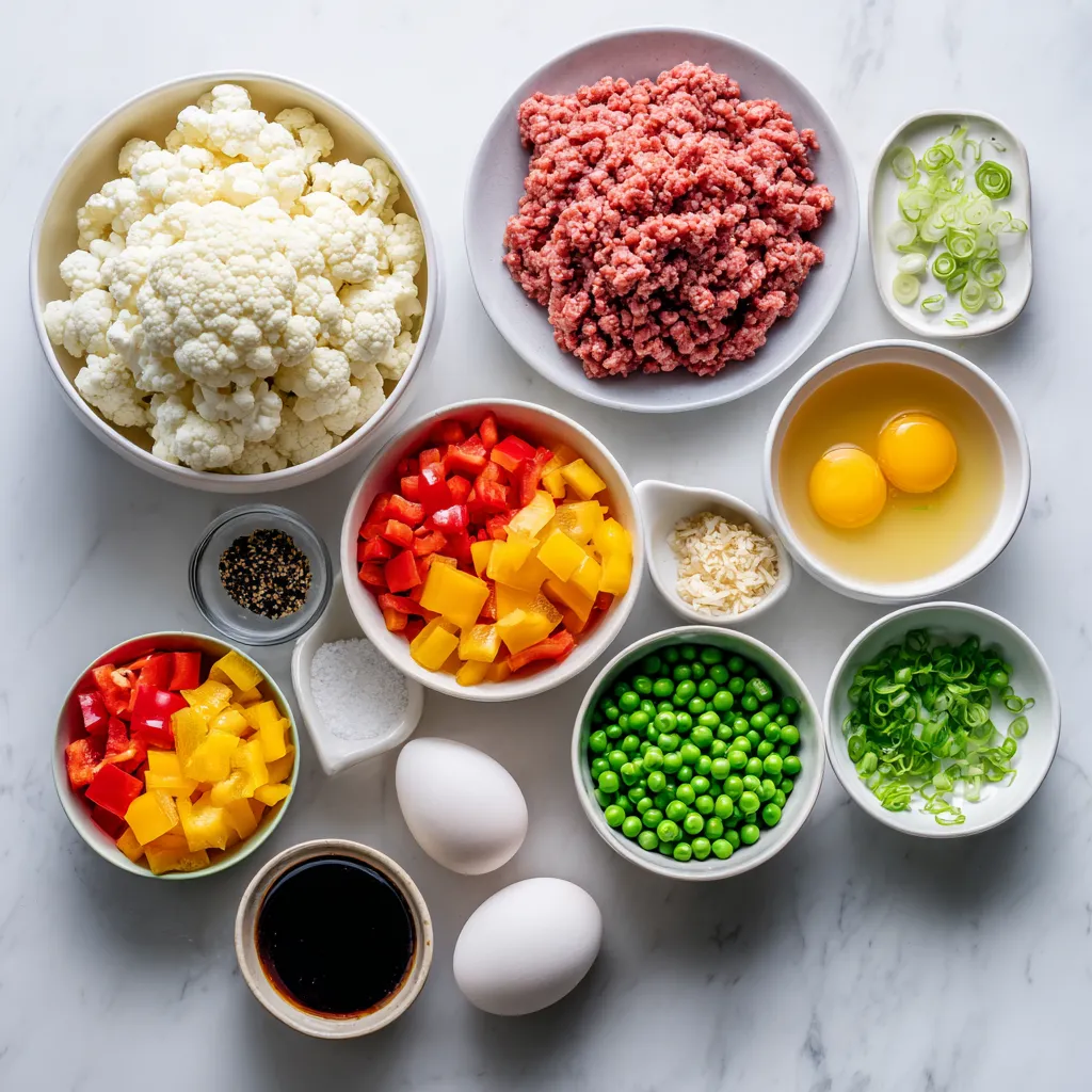 Alle notwendigen Zutaten für Keto Rindfleisch Blumenkohl gebratener Reis