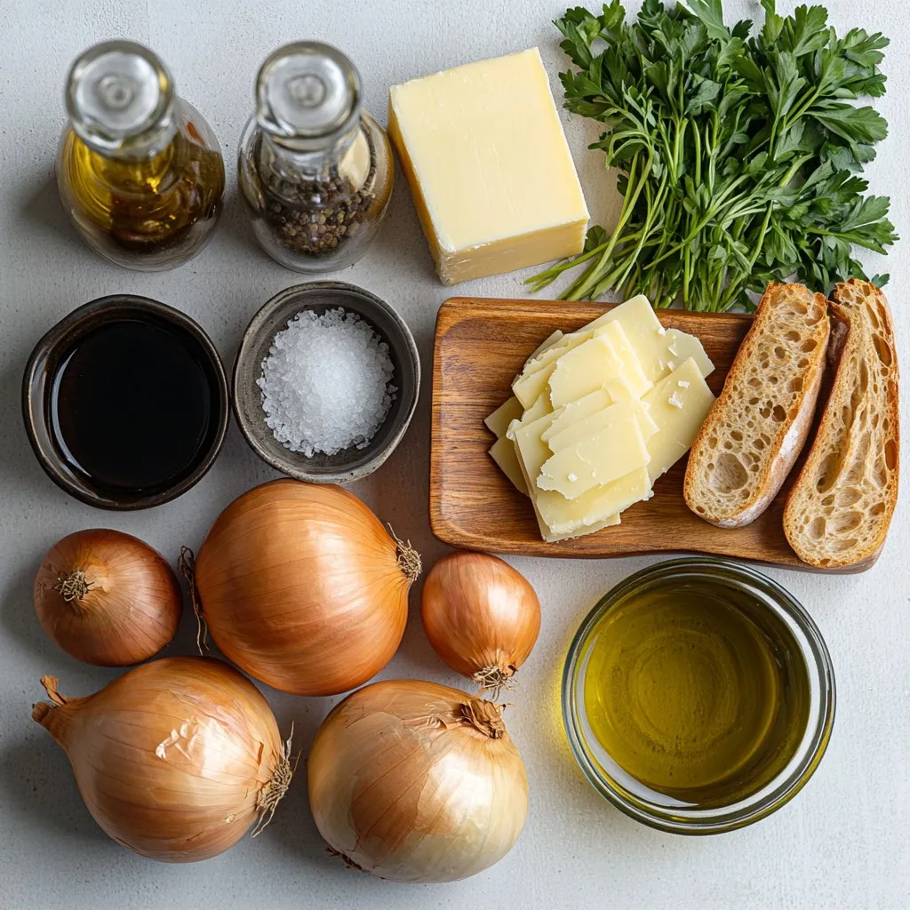 Diese Zutaten sind einfach zu finden. Die Zwiebeln sind der Star der Suppe. Sie bringen den süßen, tiefen Geschmack. Butter und Olivenöl sorgen für den perfekten Anbratgeschmack. Die Brühe macht die Suppe reichhaltig und warm.