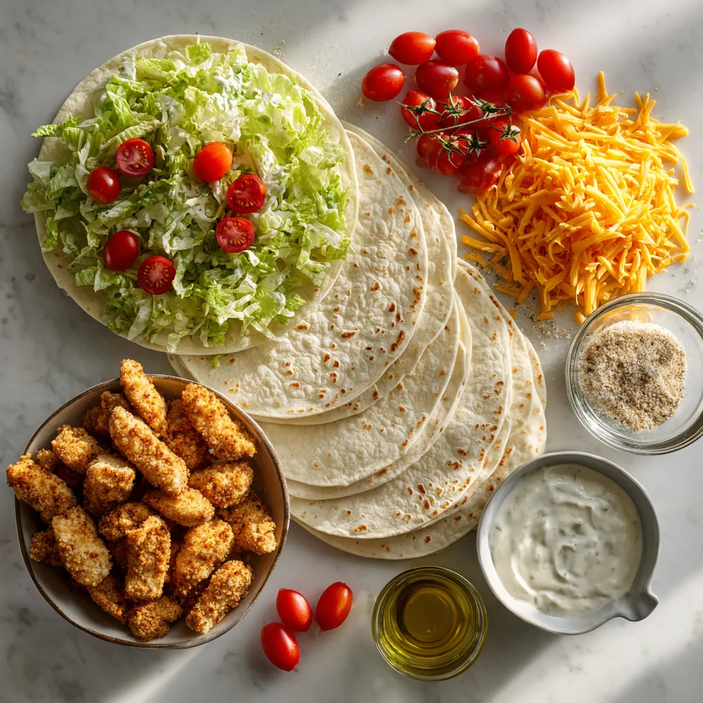 Die Hauptzutaten sind einfach zu finden. Ich empfehle, frische Kirschtomaten und Romana-Salat zu verwenden. So bleibt der Wrap knackig und frisch.