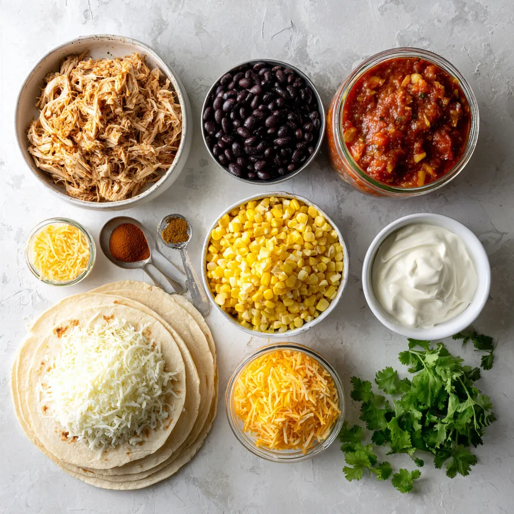 In einer großen Rührschüssel vermenge das zerrissene Hähnchen, die schwarzen Bohnen, den gekochten Reis, den Mais, die Salsa, den Kreuzkümmel und das Chilipulver. Rühre die Mischung gut um, bis alles gleichmäßig verteilt ist.