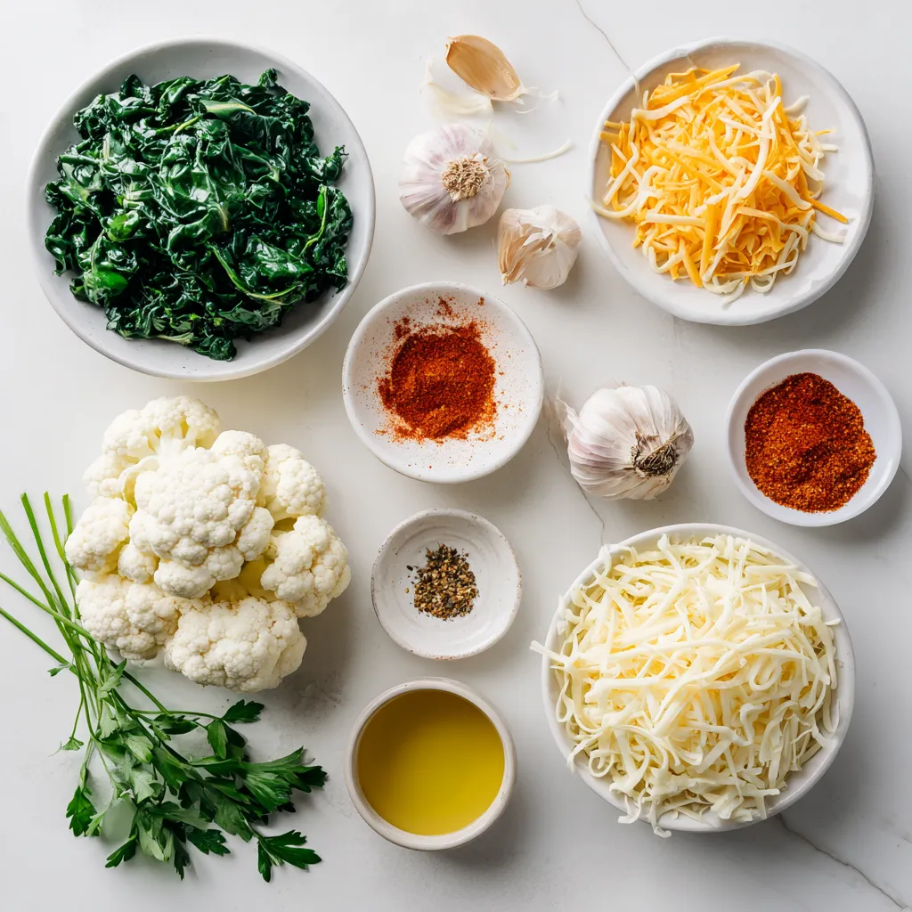 Diese Zutaten geben dem Auflauf einen tollen Geschmack und eine schöne Textur. Das zerrupfte Hähnchen ist die Hauptquelle für Eiweiß. Der Spinat und Blumenkohl bringen Vitamine und Mineralstoffe mit. Der Frischkäse macht alles schön cremig.