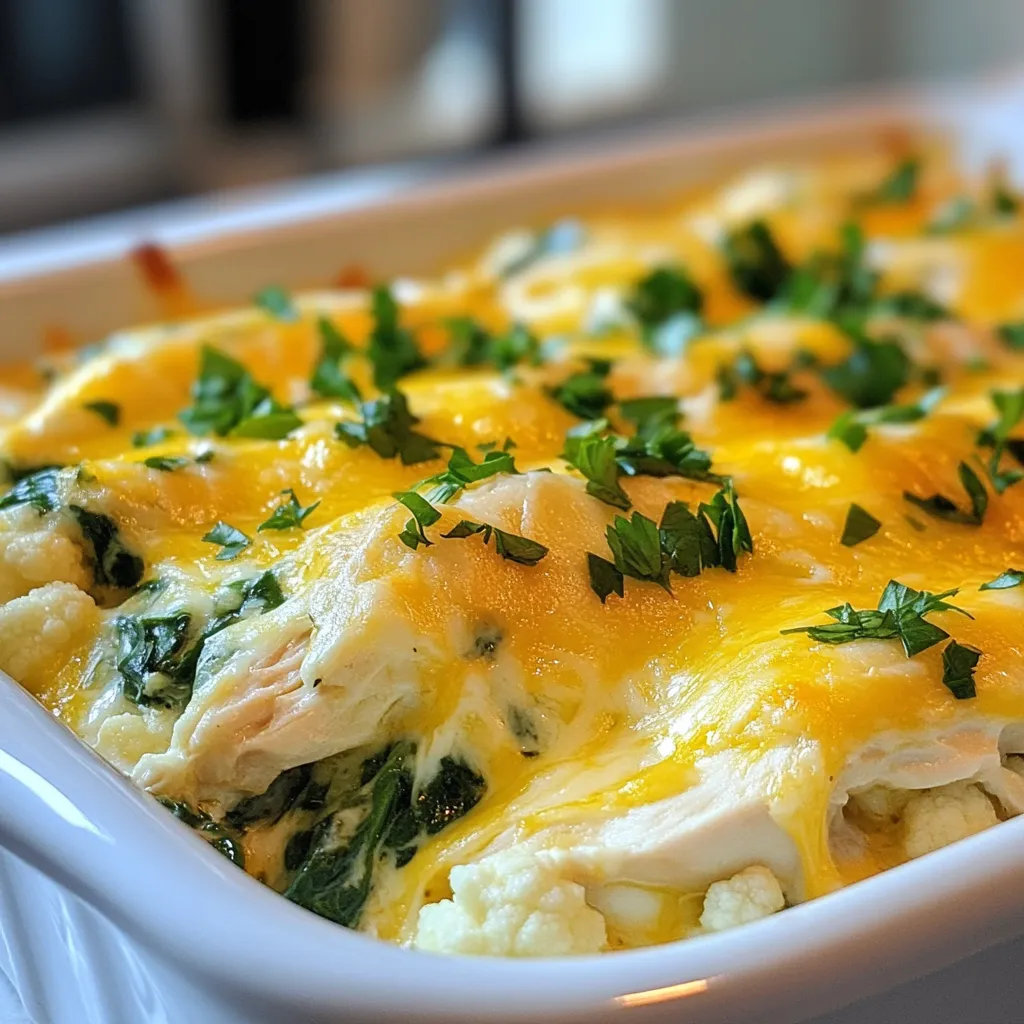 Ein herzhaftes und cremiges Hühnchen-Auflaufgericht mit Spinat und Käse.