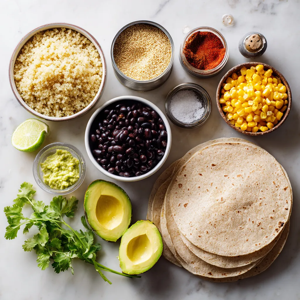 Diese Zutaten sind nahrhaft und lecker. Quinoa bietet Proteine. Schwarze Bohnen sind reich an Ballaststoffen. Mais bringt Süße und eine schöne Farbe. Rote Paprika gibt einen knackigen Biss und viel Vitamin C. Avocado sorgt für Cremigkeit und gesunde Fette. Tortillas halten alles zusammen.