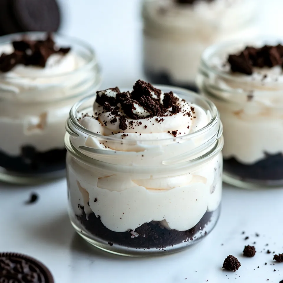 Garnieren ist wichtig! Zerbrösele einige Oreos und streue sie oben drauf. Ein Klecks Schlagsahne kann das Dessert aufpeppen. Frische Minze oder Beeren als Dekoration sehen toll aus. Stelle die Gläser auf einen großen Teller für einen schönen Effekt.
