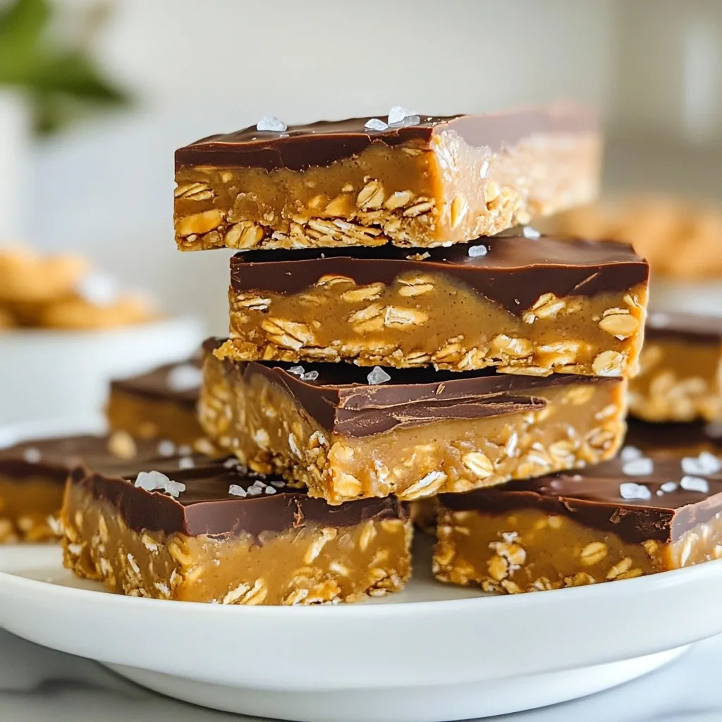 Ein einfacher und köstlicher Snack aus Erdnussbutter, Haferflocken und Schokolade, der ohne Backen zubereitet wird.