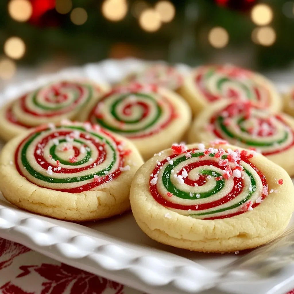 Arrangieren Sie die Kekse auf einem dekorativen Teller und garnieren Sie die Ränder mit extra zerstoßenen Pfefferminzbonbons für eine lebendige Weihnachtsdekoration.