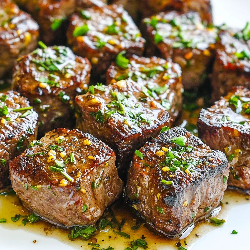 Saftige Rindfleischbissen in aromatischer Knoblauchbutter, perfekt für eine nahrhafte Mahlzeit.
