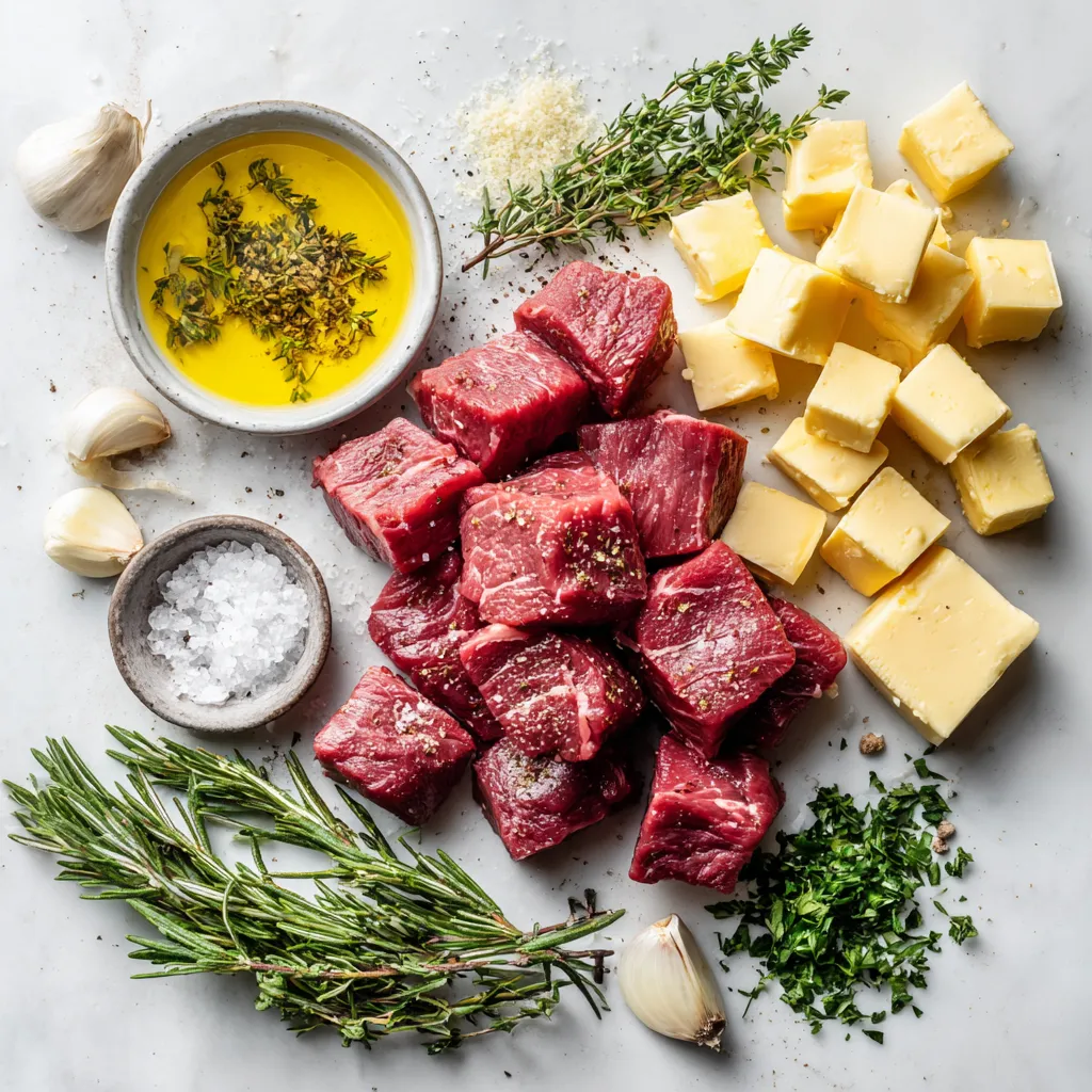 Diese Zutaten sind die Basis für deinen Geschmack. Die Rinderfiletwürfel liefern viel Protein. Die Butter macht die Bissen reichhaltig und zart. Der Knoblauch gibt einen tollen, starken Geschmack. Rosmarin und Thymian fügen frische Aromen hinzu.