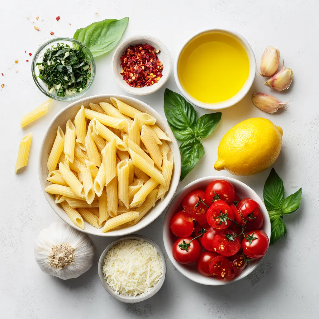 Jede Zutat spielt eine wichtige Rolle. Die Penne-Nudeln sind die Basis des Gerichts. Das Olivenöl bringt Geschmack und hilft beim Braten. Der Knoblauch gibt ein tolles Aroma. Die Kirschtomaten sorgen für Frische und Süße. Parmesan fügt eine cremige Note hinzu, während Basilikum den Geschmack abrundet. Die Zitrone bringt eine spritzige Frische.
