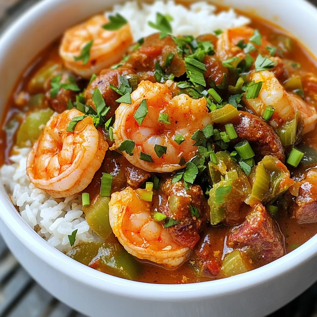 Ein würziges und herzhaftes Gumbo mit Garnelen und Wurst, perfekt für ein gemütliches Abendessen.