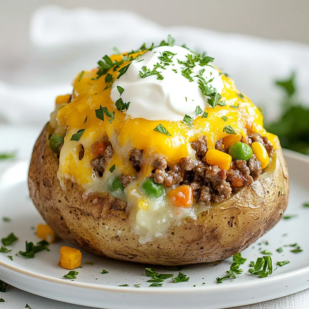 Ein herzhaftes Gericht aus gefüllten Backkartoffeln mit Hackfleisch und Gemüse.
