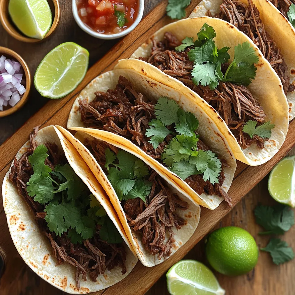 Für die Zubereitung von Barbacoa-Rindfleisch brauchst du: - 1,1 kg Rinderbraten (Chuck Roast), von Fett befreit und in große Stücke geschnitten - 1 Esslöffel Olivenöl - 4 Knoblauchzehen, fein gehackt - 1 kleine Zwiebel, gewürfelt - 2-3 Chipotle-Paprika in Adobosauce, fein gehackt - 120 ml Rinderbrühe - 60 ml Limettensaft Diese Zutaten sorgen für einen kräftigen und reichen Geschmack. Das Rindfleisch ist der Star des Gerichts. Die Gewürze sind entscheidend für den Geschmack: - 1 Esslöffel gemahlener Kreuzkümmel - 1 Esslöffel getrockneter Oregano - 1 Teelöffel schwarzer Pfeffer - 1 Teelöffel Salz - Frischer Koriander, gehackt (zum Garnieren) Diese Gewürze bringen die Aromen zusammen. Sie machen dein Barbacoa-Rindfleisch besonders lecker. Für die Tacos empfehle ich: - Maistortillas Maistortillas passen perfekt zum Barbacoa-Rindfleisch. Sie sind weich und nehmen die Säfte gut auf. Du kannst auch andere Tortilla-Varianten probieren, wenn du magst. Zuerst erhitze das Olivenöl in einer großen Pfanne. Stelle die Hitze auf mittel bis hoch. Füge die Rinderstücke hinzu und brate sie rundherum an. Dies dauert etwa 4 bis 5 Minuten. Das Fleisch sollte schön braun sein. Nimm das Fleisch aus der Pfanne und stelle es beiseite. Jetzt bereite die Gewürzmischung vor. In den Slow Cooker gib den gehackten Knoblauch, die gewürfelte Zwiebel, Chipotle-Paprika, Kreuzkümmel, Oregano, schwarzen Pfeffer und Salz. Rühre alles gut durch, damit sich die Zutaten gleichmäßig verteilen. Lege die angebratenen Rinderstücke auf die Gewürzmischung im Slow Cooker. Gieße die Rinderbrühe und den Limettensaft über das Fleisch. Achte darauf, dass das Fleisch gut bedeckt ist. Setze den Deckel auf den Slow Cooker. Stelle ihn auf niedrig für 8 Stunden oder hoch für 4 Stunden ein. Das Fleisch wird zart und lässt sich leicht zerkleinern. Nach dem Kochen nimm das Fleisch aus dem Slow Cooker. Zerkleinere das Fleisch mit zwei Gabeln. Gib das zerkleinerte Fleisch zurück in den Slow Cooker. Mische es gut mit dem Saft, um den Geschmack zu intensivieren. Erhitze die Maistortillas in einer trockenen Pfanne bei mittlerer Hitze. Dies dauert etwa 30 Sekunden auf jeder Seite. Die Tortillas sollten biegsam sein. Lege eine Portion des Barbacoa-Rindfleischs in jede Tortilla. Garniere sie mit frischem Koriander. Du kannst auch gewürfelte Zwiebeln, Salsa oder Avocado hinzufügen. Serviere die Tacos auf einem rustikalen Holzbrett. Füge Limettenviertel und gehackte Zwiebeln in kleinen Schüsseln hinzu. So können die Gäste ihre Tacos nach Belieben anpassen. Um dein Barbacoa-Rezept zu perfektionieren, achte auf die Qualität des Fleisches. Wähle einen gut marmorierten Rinderbraten. Das Fett sorgt für Geschmack und Zartheit. Auch die Gewürze sind wichtig. Lass die Mischung gut in das Fleisch einziehen. Du kannst das Barbacoa auch über Nacht marinieren. So wird der Geschmack noch intensiver. Ein häufiger Fehler ist das Überkochen des Fleisches. Achte darauf, die Garzeit nicht zu überschreiten. Wenn das Fleisch zu lange kocht, wird es trocken. Ein weiterer Fehler ist das Ignorieren der Flüssigkeitsmenge. Stelle sicher, dass das Fleisch gut mit Brühe und Limettensaft bedeckt ist. Das hilft, das Fleisch saftig zu halten. Für eine einladende Präsentation serviere die Tacos auf einem rustikalen Holzbrett. Platziere Limettenviertel und gehackte Zwiebeln in kleinen Schüsseln daneben. So können Gäste ihre Tacos nach Belieben anpassen. Frischer Koriander gibt den Tacos einen schönen Farbkontrast und zusätzlichen Geschmack. {{image_4}} Wenn du eine fleischlose Option möchtest, probiere Jackfruit! Sie hat eine ähnliche Konsistenz wie das Rindfleisch. Du kannst die Jackfruit mit den gleichen Gewürzen kochen. Verwende die Chipotle-Paprika und Limettensaft für den tollen Geschmack. Eine andere leckere Wahl ist der Tempeh. Er nimmt die Aromen gut auf und ist voll mit Proteinen. Maistortillas sind klassisch, aber du kannst auch Weizentortillas verwenden. Sie sind weich und leicht zu rollen. Für etwas mehr Crunch, probiere Tortilla-Chips. Sie sind perfekt für einen Taco-Salat. Eine glutenfreie Option sind Tortillas aus Reis oder Blumenkohl. Diese Alternativen machen deine Tacos einzigartig. Garnierungen machen Tacos noch besser! Probiere frisch gehackten Koriander für einen frischen Geschmack. Avocado oder Guacamole bringen Cremigkeit. Füge gewürfelte Zwiebeln oder Salsa für etwas Schärfe hinzu. Du kannst auch Käse wie Cotija oder Cheddar verwenden. Für einen besonderen Kick, füge eingelegte Jalapeños hinzu. Experimentiere mit verschiedenen Kombinationen und finde deinen Favoriten! Um Rindfleischreste richtig zu lagern, lass sie zuerst abkühlen. Wickel das Fleisch dann fest in Frischhaltefolie oder lege es in einen luftdichten Behälter. So bleibt es frisch. Du kannst die Reste bis zu drei Tage im Kühlschrank aufbewahren. Achte darauf, das Fleisch vor dem Servieren gut zu prüfen. Wenn du das Barbacoa länger aufbewahren möchtest, friere es ein. Teile das zerkleinerte Fleisch in Portionen auf. Leg das Fleisch in Gefrierbeutel oder luftdichte Behälter. Achte darauf, die Luft gut herauszudrücken, bevor du sie verschließt. Im Gefrierschrank hält Barbacoa bis zu drei Monate. Um die Reste wieder zu erwärmen, nimm das Fleisch aus dem Kühlschrank oder Gefrierschrank. Wenn es gefroren ist, lass es zuerst im Kühlschrank auftauen. Erhitze das Barbacoa in einem Topf bei mittlerer Hitze. Füge etwas Rinderbrühe hinzu, um es saftig zu halten. Rühre regelmäßig um, bis es heiß ist. Du kannst auch die Mikrowelle benutzen. Erwärme das Fleisch in kurzen Intervallen, bis es gleichmäßig warm ist. Du kannst Barbacoa bis zu 4 Tage im Kühlschrank aufbewahren. Stelle sicher, dass das Fleisch in einem luftdichten Behälter ist. So bleibt es frisch und lecker. Wenn du es länger aufbewahren möchtest, friere es ein. Das ist eine gute Idee, um den Geschmack zu bewahren. Ja, das kannst du! Um Barbacoa im Ofen z