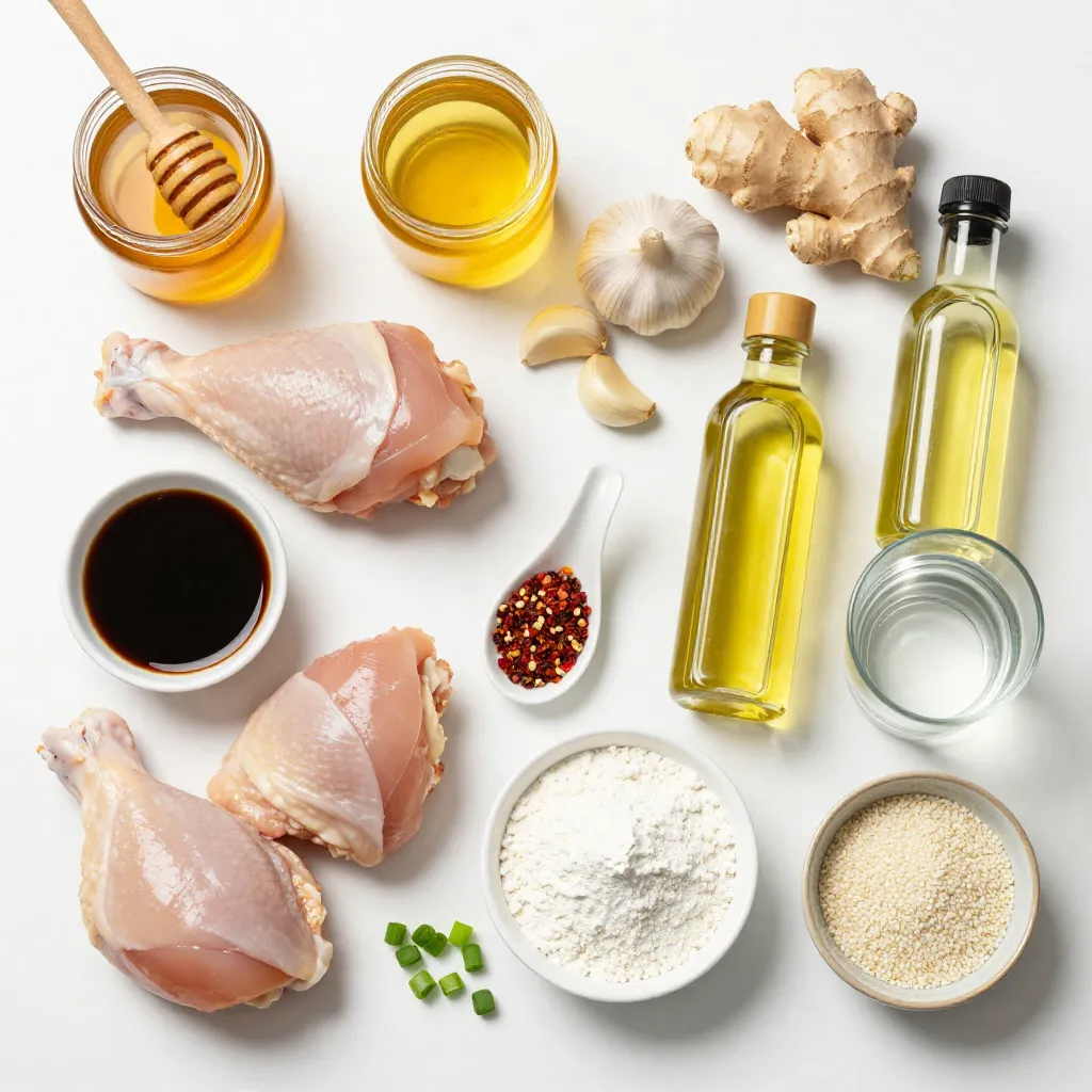 Die Hauptzutaten machen dieses Gericht besonders lecker. Die Hähnchenschenkel sind schön zart und saftig. Honig bringt Süße und eine klebrige Textur. Sojasauce fügt Umami hinzu und balanciert die Aromen. Knoblauch und Ingwer geben Frische und Tiefe.
