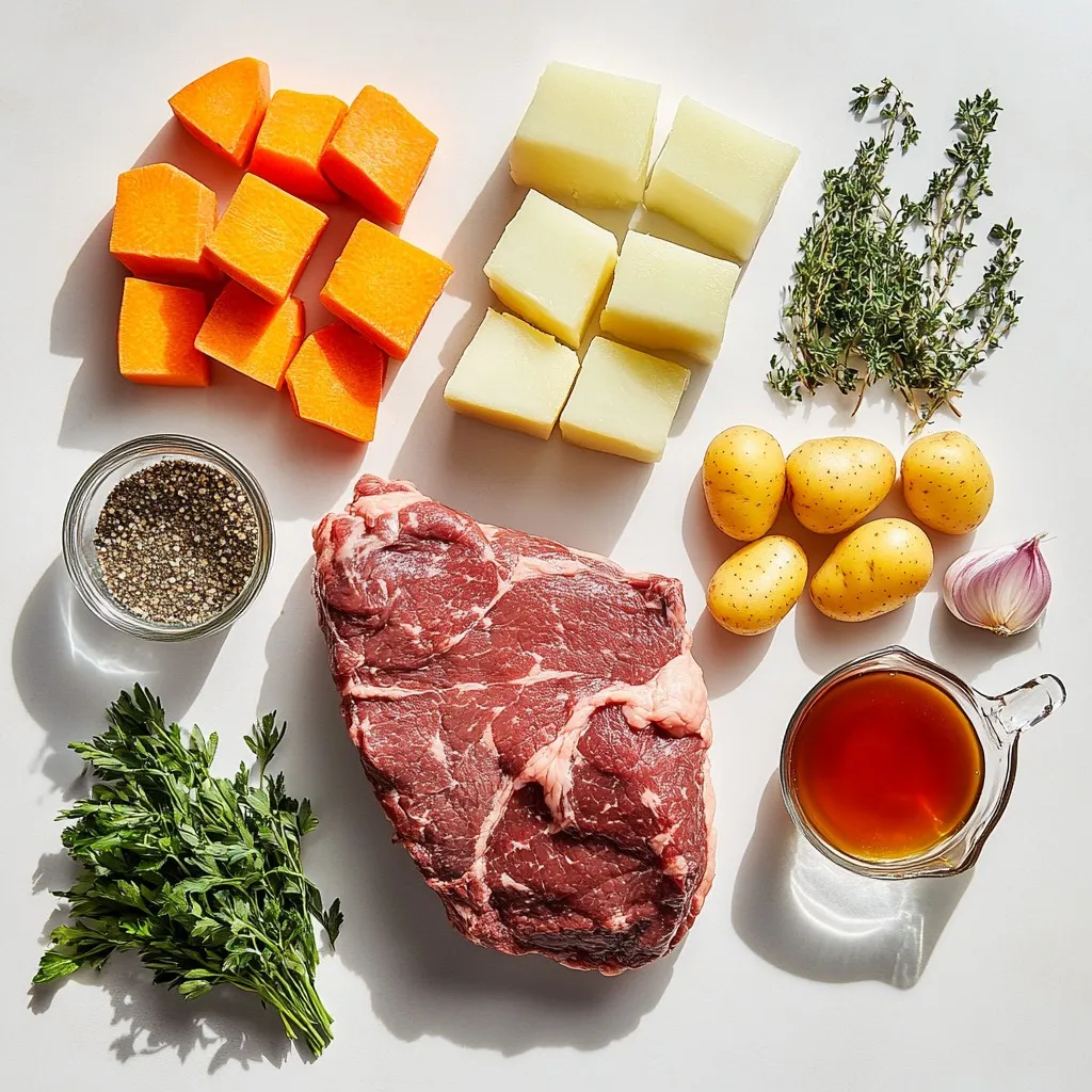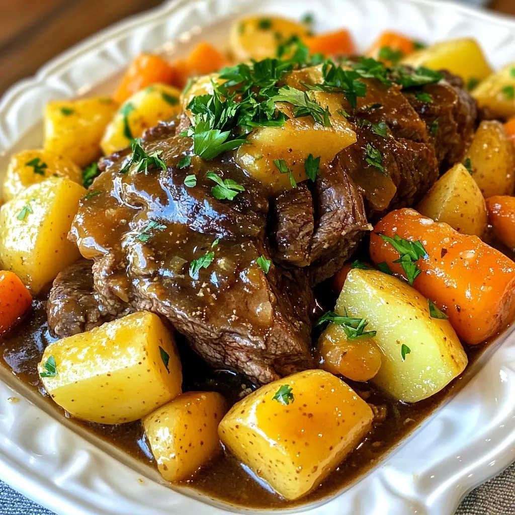 In diesem Rezept benutzen wir Rinderschmorbraten. Das Fleisch wird zart und saftig. Ahornsirup und Dijon-Senf geben eine spannende Geschmackskombination. Die Karotten und Kartoffeln sorgen für eine schöne Beilage. Zwiebeln und Knoblauch fügen mehr Aroma hinzu. Gewürze wie Thymian und Rosmarin bringen Frische in das Gericht. Die Rinderbrühe sorgt für eine reichhaltige Flüssigkeit, die das Fleisch umgibt. Am Ende garnieren wir das Gericht mit frischer Petersilie. So sieht der Slow Cooker Pot Roast nicht nur gut aus, sondern schmeckt auch köstlich!