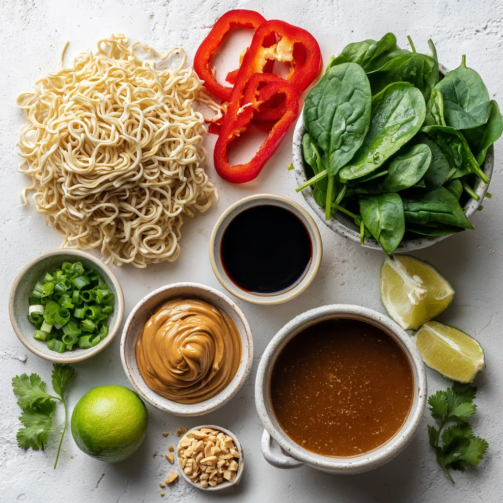 Um Spicy Peanut Ramen zuzubereiten, benötigst du einige Hauptzutaten. Du brauchst 200g Ramen-Nudeln. Diese Nudeln sind weich und ziehen die Sauce gut auf. Ein Esslöffel Sesamöl gibt einen tollen Geschmack. Eine Tasse Gemüsebrühe sorgt für die Basis der Sauce. Die cremige Erdnussbutter (1/2 Tasse) ist der Star des Gerichts.