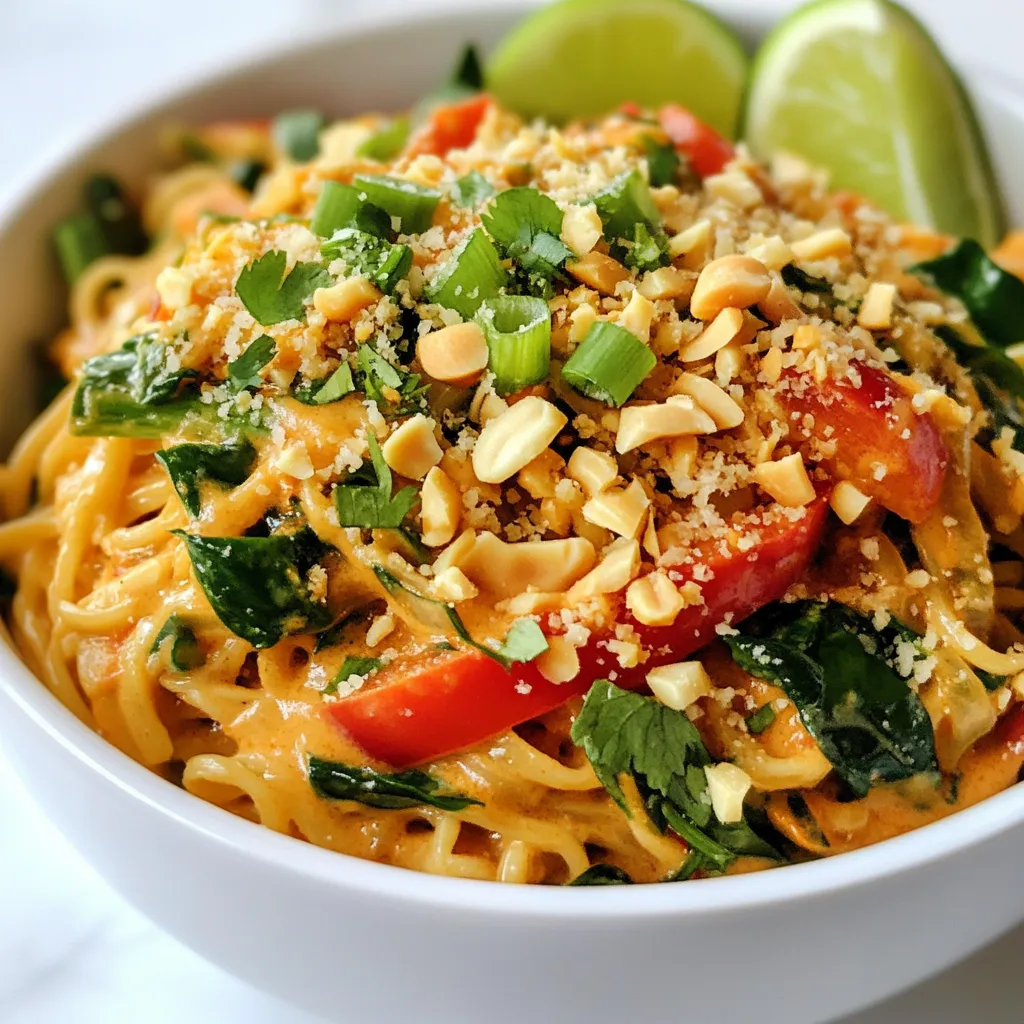 Jetzt füge ich die geschnittene rote Paprika in die Pfanne. Ich gare sie 2 bis 3 Minuten, bis sie weich ist. Danach gebe ich die gekochten Ramen-Nudeln und 1 Tasse Baby-Spinat hinzu. Ich mische alles vorsichtig, damit die Nudeln die Sauce gut aufnehmen. Nach weiteren 2 bis 3 Minuten ist alles heiß und bereit. Ich serviere die Nudeln mit gehackter Frühlingszwiebel, zerstoßenen Erdnüssen, frischem Koriander und Limettenvierteln.