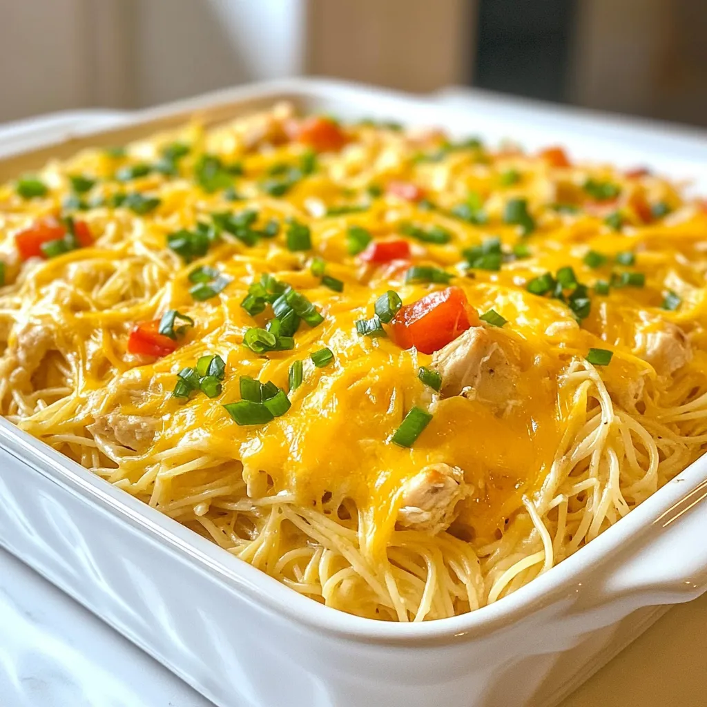 Ein herzhaftes und würziges Hühnchen-Spaghetti-Gericht, das im Ofen gebacken wird.