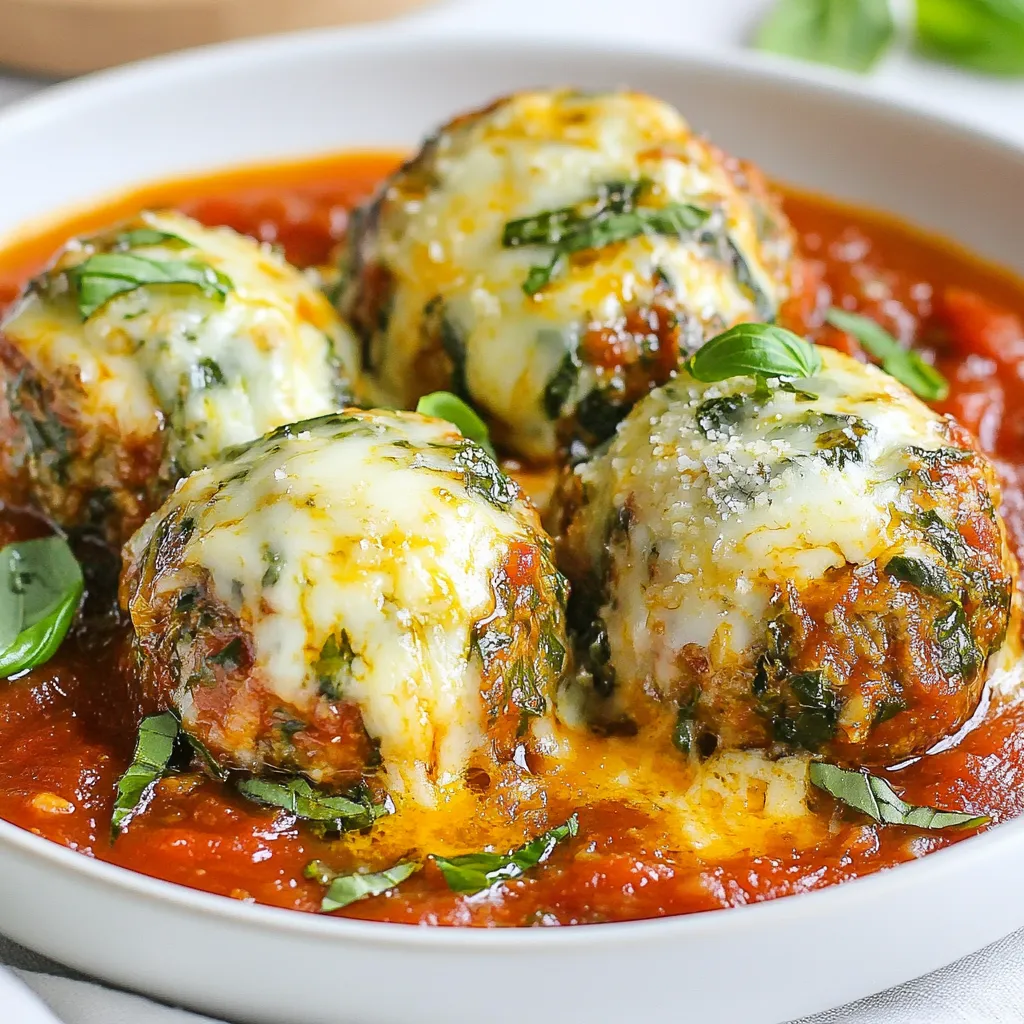 Saftige Fleischbällchen mit Spinat, Knoblauch und Mozzarella, serviert in Marinara-Sauce.