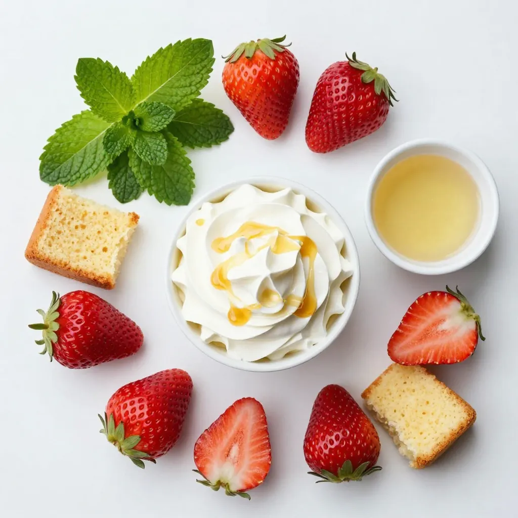 Diese Zutaten machen die Kabobs frisch und lecker. Die Erdbeeren bringen Süße und Frische. Der Biskuitkuchen sorgt für eine weiche Textur. Die Schlagsahne macht alles schön cremig.