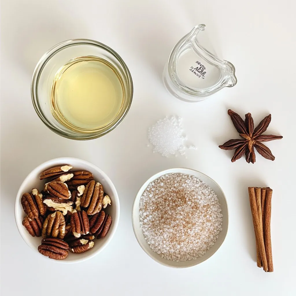 Diese Zutaten sind leicht zu finden. Die Pekannüsse geben den Nüssen ihren besonderen Geschmack. Der Zucker und das Wasser bilden den Karamell. Zimt und Vanille geben zusätzliches Aroma.