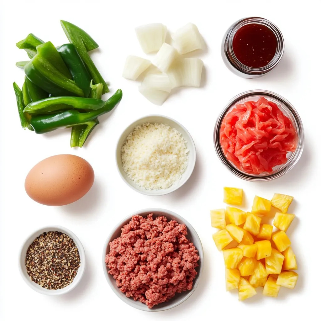 Fügen Sie die gewürfelte grüne Paprika, die Zwiebel und die Ananasstücke hinzu und falten Sie sie vorsichtig unter die Fleischmischung, bis alles gleichmäßig verteilt ist.