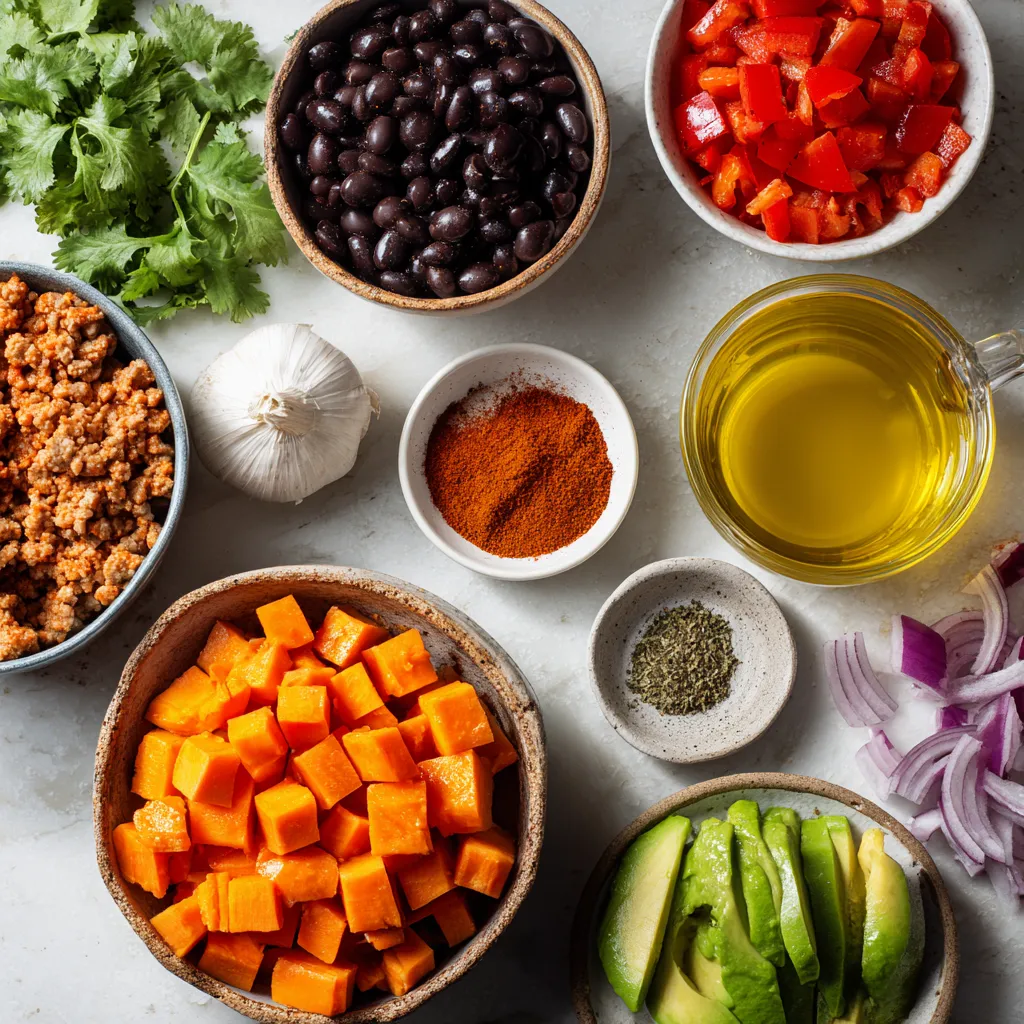 Ein herzhaftes Chili mit gemahlenem Truthahn, Süßkartoffeln und schwarzen Bohnen.