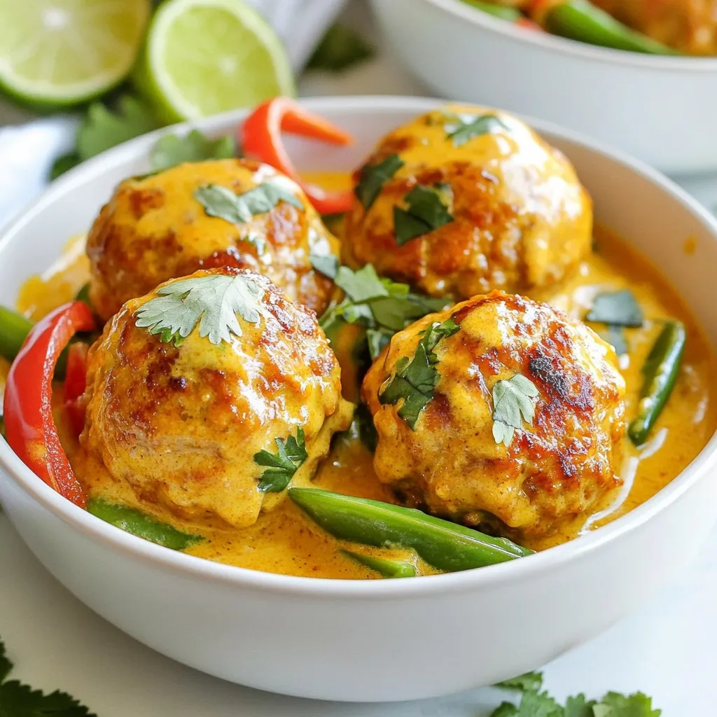 Ein köstliches thailändisches Gericht mit saftigen Fleischbällchen in einer aromatischen Kokosnuss-Curry-Sauce.
