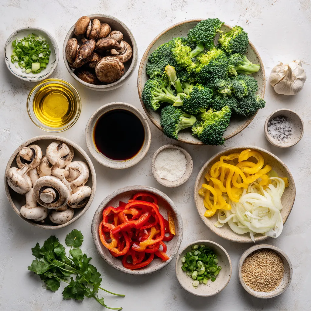 Diese Zutaten geben dem Gericht Farbe und Geschmack. Brokkoli bringt viele Vitamine mit. Pilze fügen eine herzliche Textur hinzu. Paprika sorgt für Süße und Zwiebeln bringen Aroma.