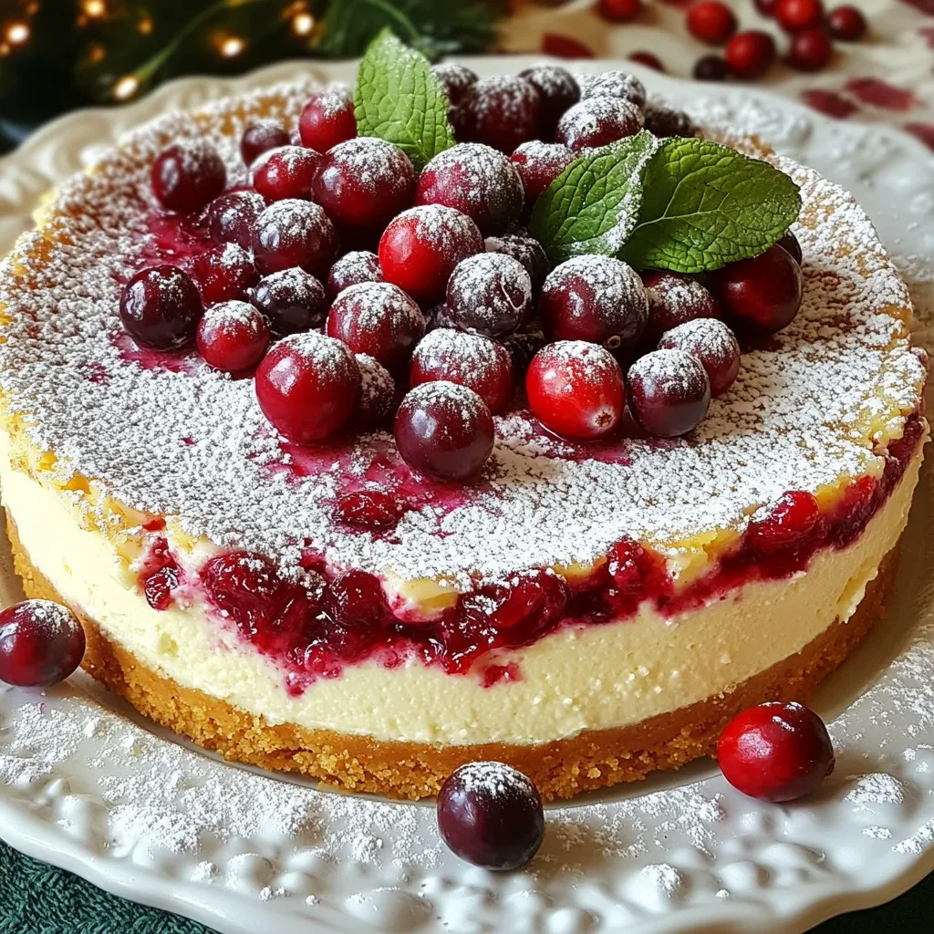 Servieren Sie den Käsekuchen auf einem festlichen Teller, garniert mit Minzblättern und ganzen Cranberries.