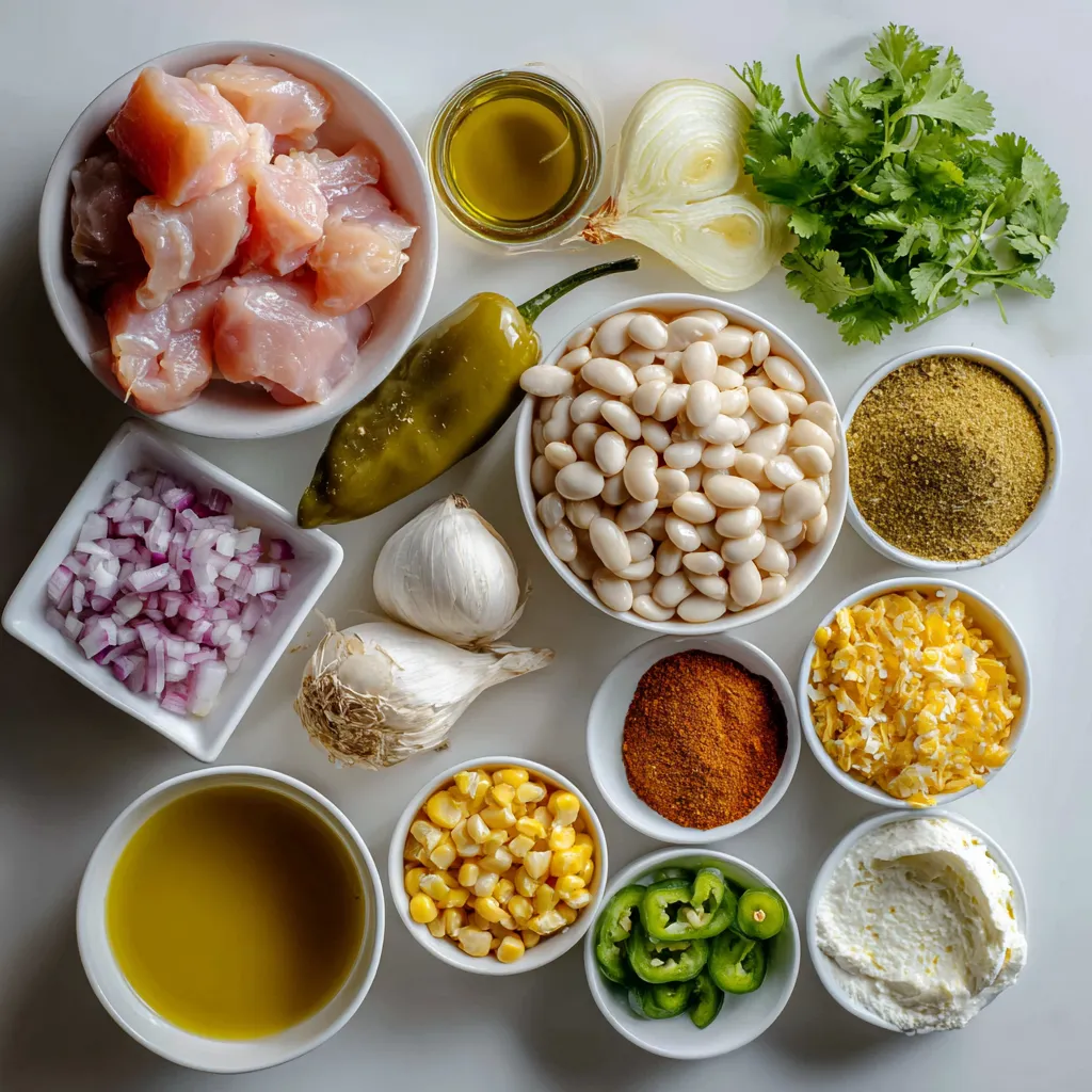 Die Hauptzutaten machen dieses Gericht so besonders. Zuerst verwenden wir Hähnchenbrustfilets. Diese sind zart und leicht zu kochen. Dann kommen die weißen Bohnen. Sie geben uns eine cremige Textur und sind reich an Ballaststoffen. Die Hühnerbrühe sorgt für einen vollen Geschmack und macht das Chili saftig.